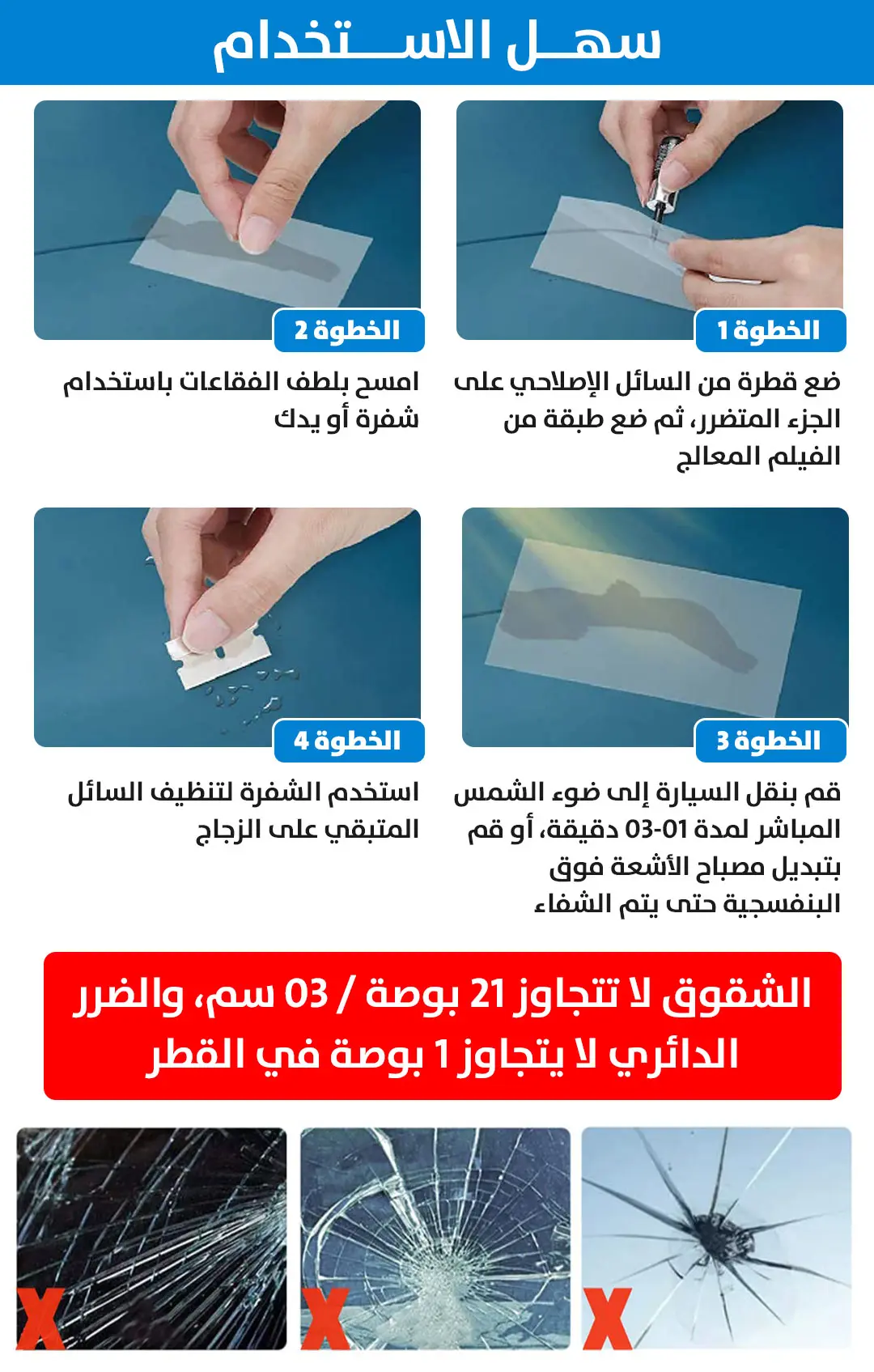 صُمم "راتنج إصلاح الزجاج الأمامي" لإصلاح الأضرار الطفيفة في زجاج السيارات الأمامي المصفح. يتيح لأي شخص إصلاح أي زجاج أمامي أو نافذة تالفة.