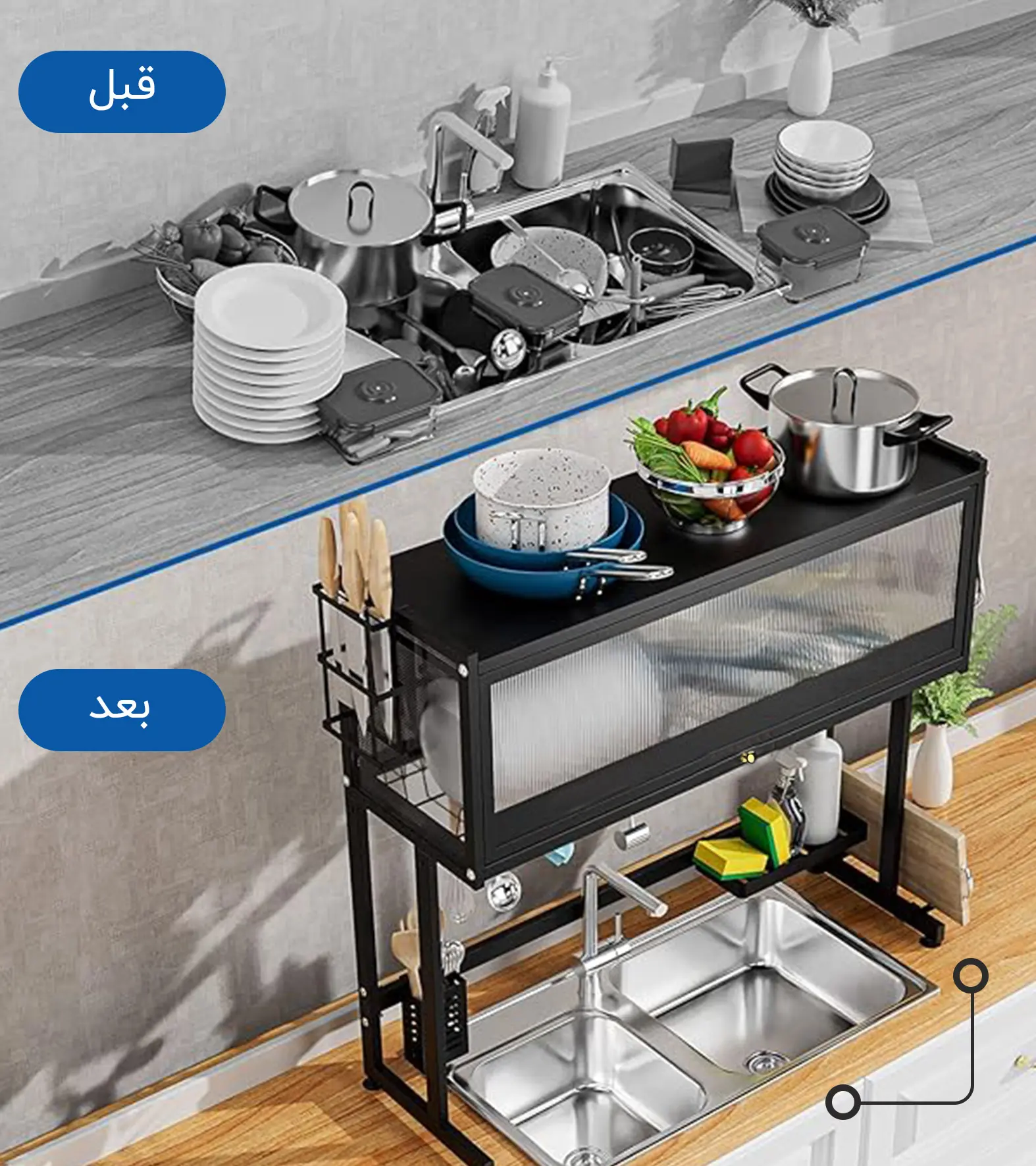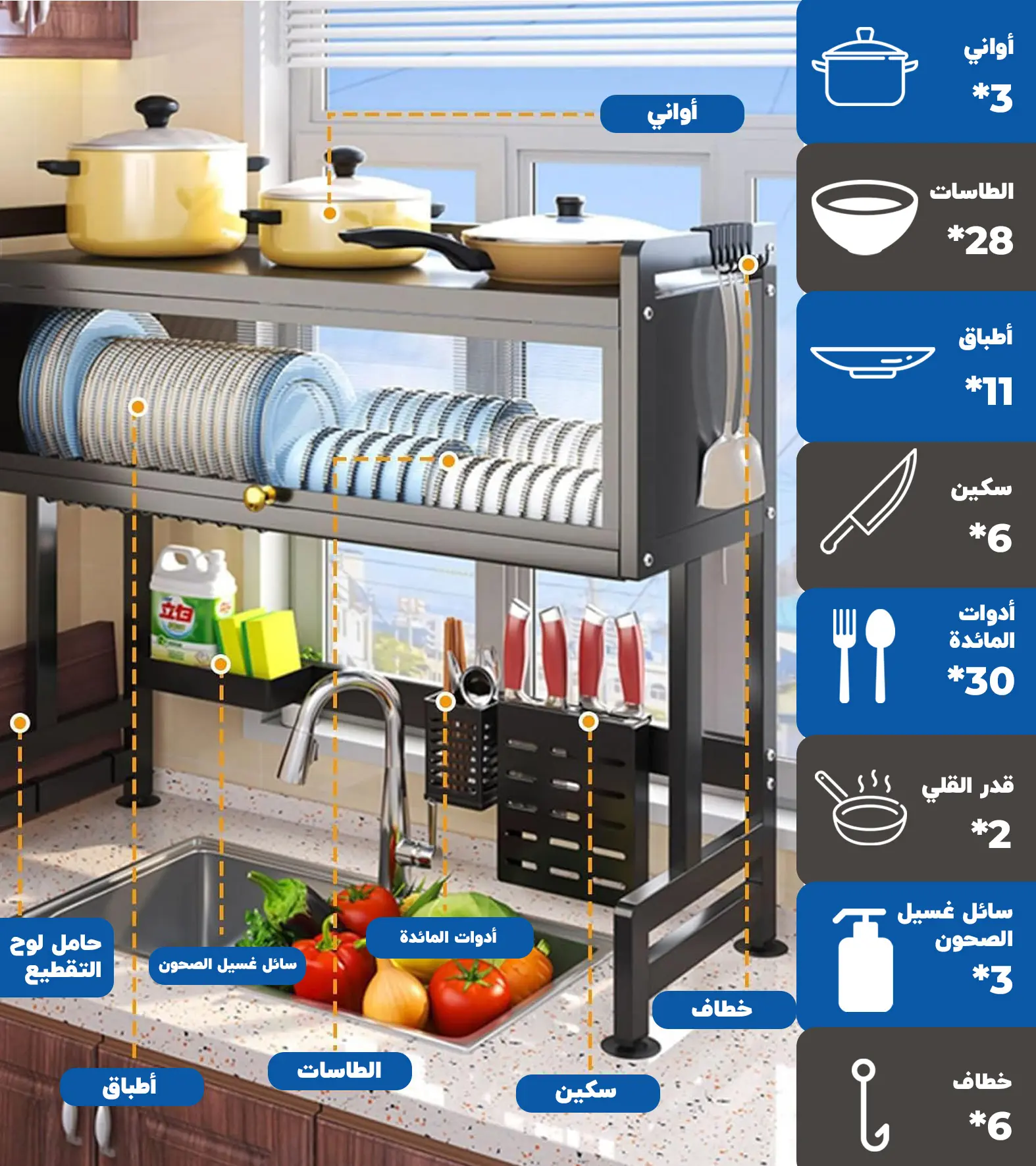 ملحقات عملية: يتميز بحامل أدوات مائدة قابل للإزالة وخطافات لتعليق مناشف الأطباق أو أدوات التنظيف.